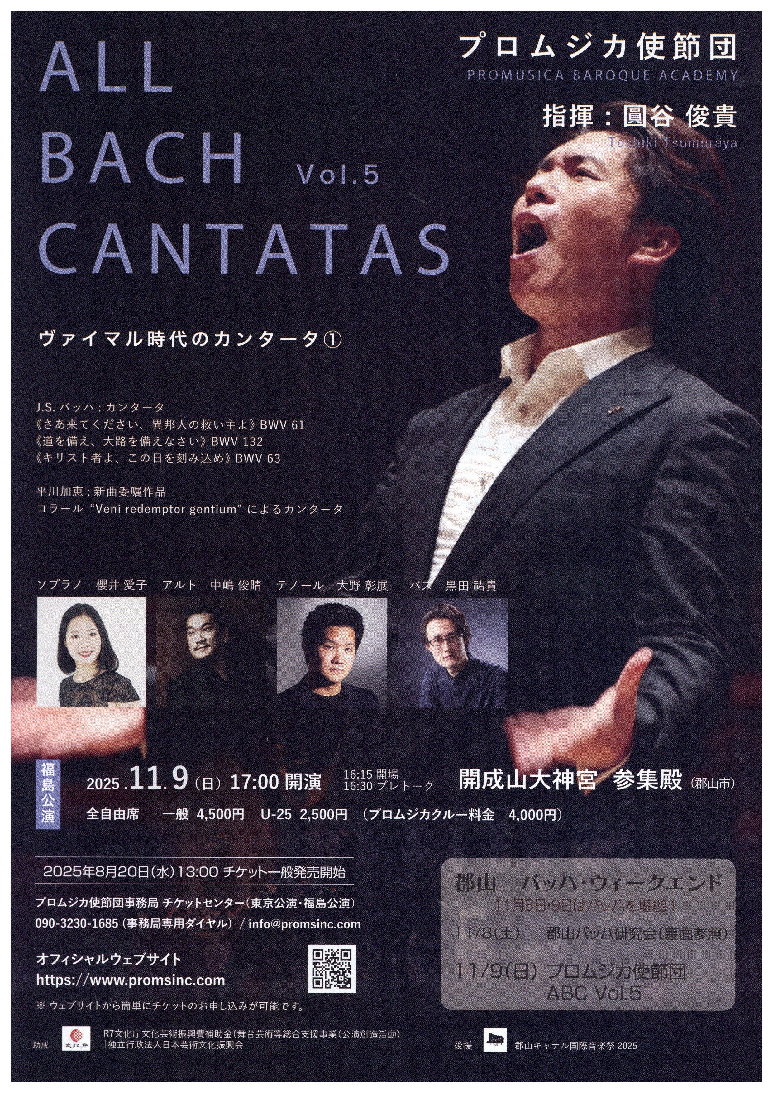 音楽 その他 All Bach Cantatas Vol.5 ヴァイマル時代のカンタータ① 開催日時 2025年11月9日(日) 17:00開演 会場 開成山大神宮 参集殿 入場料 全席自由一般 4,500円全席自由U-25 2,500円※未就学児不可 会場は「開成山大神宮」となります。 詳細情報 詳細・最新情報は、プロムジカ使節団のウェブサイト(外部サイトhttps://promsinc.com/abc5_k/)をご覧ください。