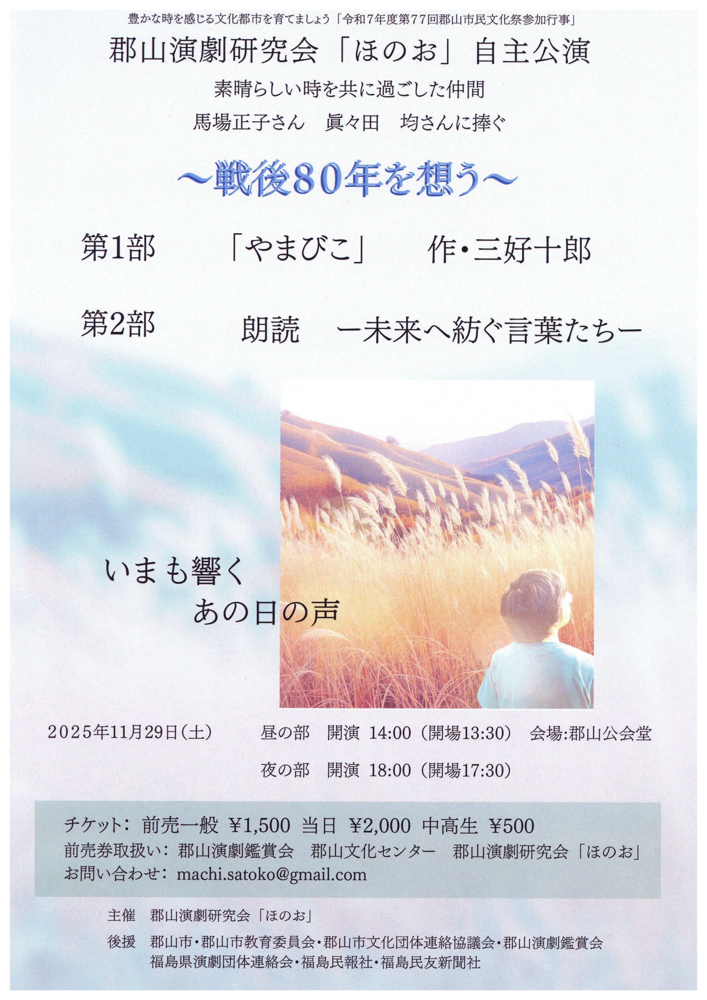 演劇 その他 郡山演劇研究会「ほのお」自主公演(第77回郡山市民文化祭参加行事) 開催日時 2025年11月29日(土) (1)14:00開演 (2)18:00開演 会場 郡山市公会堂(郡山市麓山1丁目8-4) 入場料 前売 1,500円当日 2,000円中高生 500円 会場は「郡山公会堂」となります。