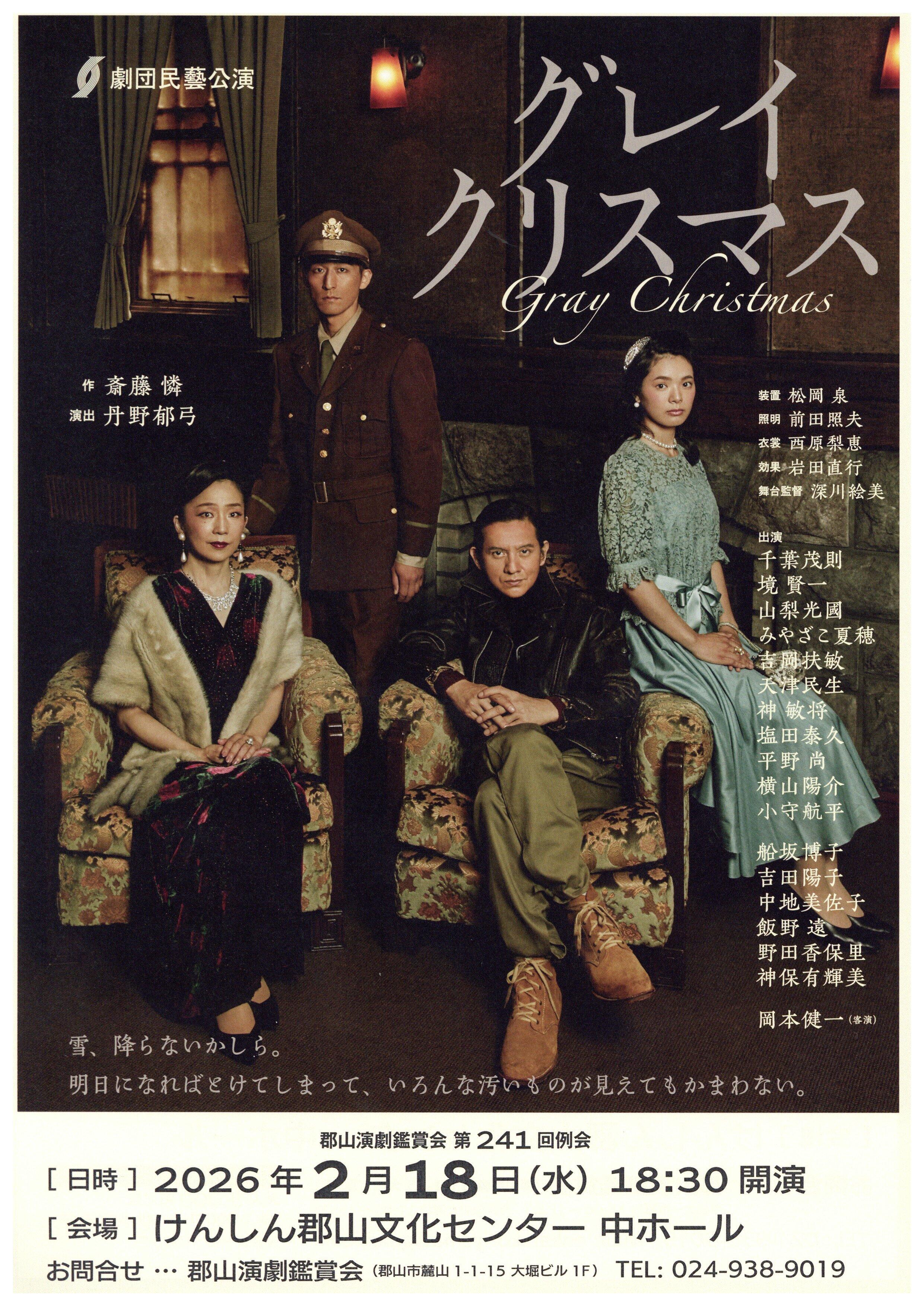 演劇 中ホール 郡山演劇鑑賞会第241回例会 劇団民藝「グレイクリスマス」 開催日時 2026年2月18日(水) 18:30開演 会場 中ホール 入場料 会員制 詳細情報 詳細・最新情報は、郡山演劇鑑賞会のウェブサイトを(外部サイトhttps://enkanunei.wixsite.com/home)ご覧ください。