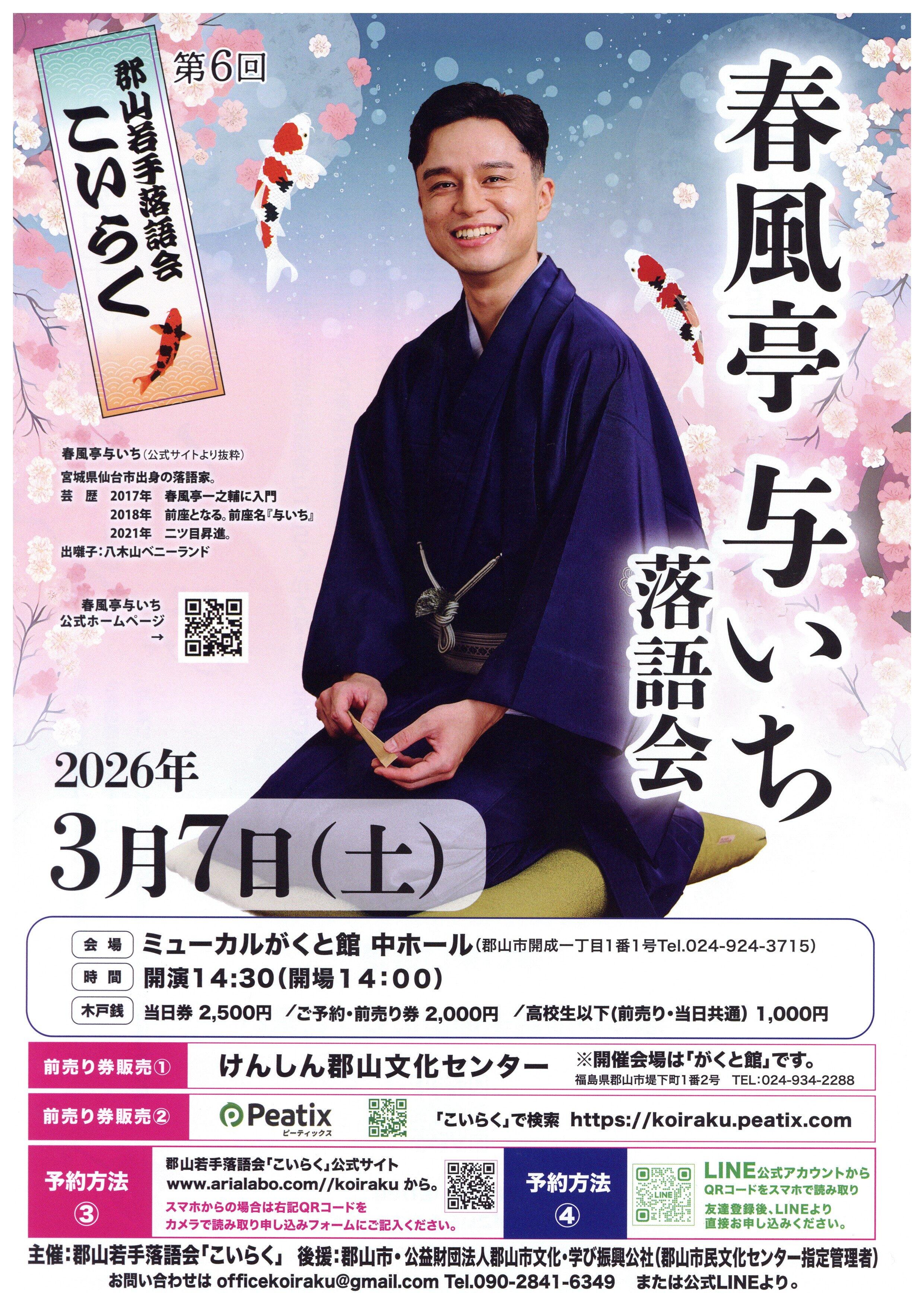 詳細は、郡山若手落語会「こいらく」のウェブサイト(外部サイト https://www.arialabo.com/koiraku)をご覧ください。
