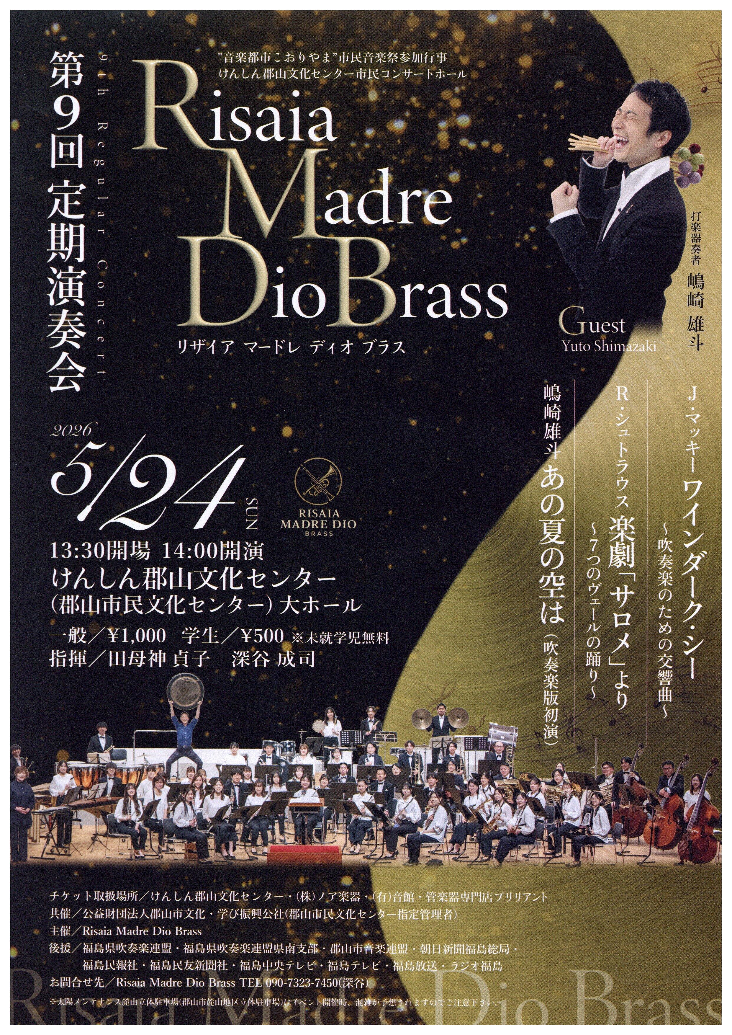 音楽 大ホール 市民コンサートホール Risaia Madre Dio Brass 第9回定期演奏会 開催日時 2026年5月24日(日) 14:00開演 会場 大ホール 入場料 入場券 1,000円高校生以下 500円未就学児入場無料