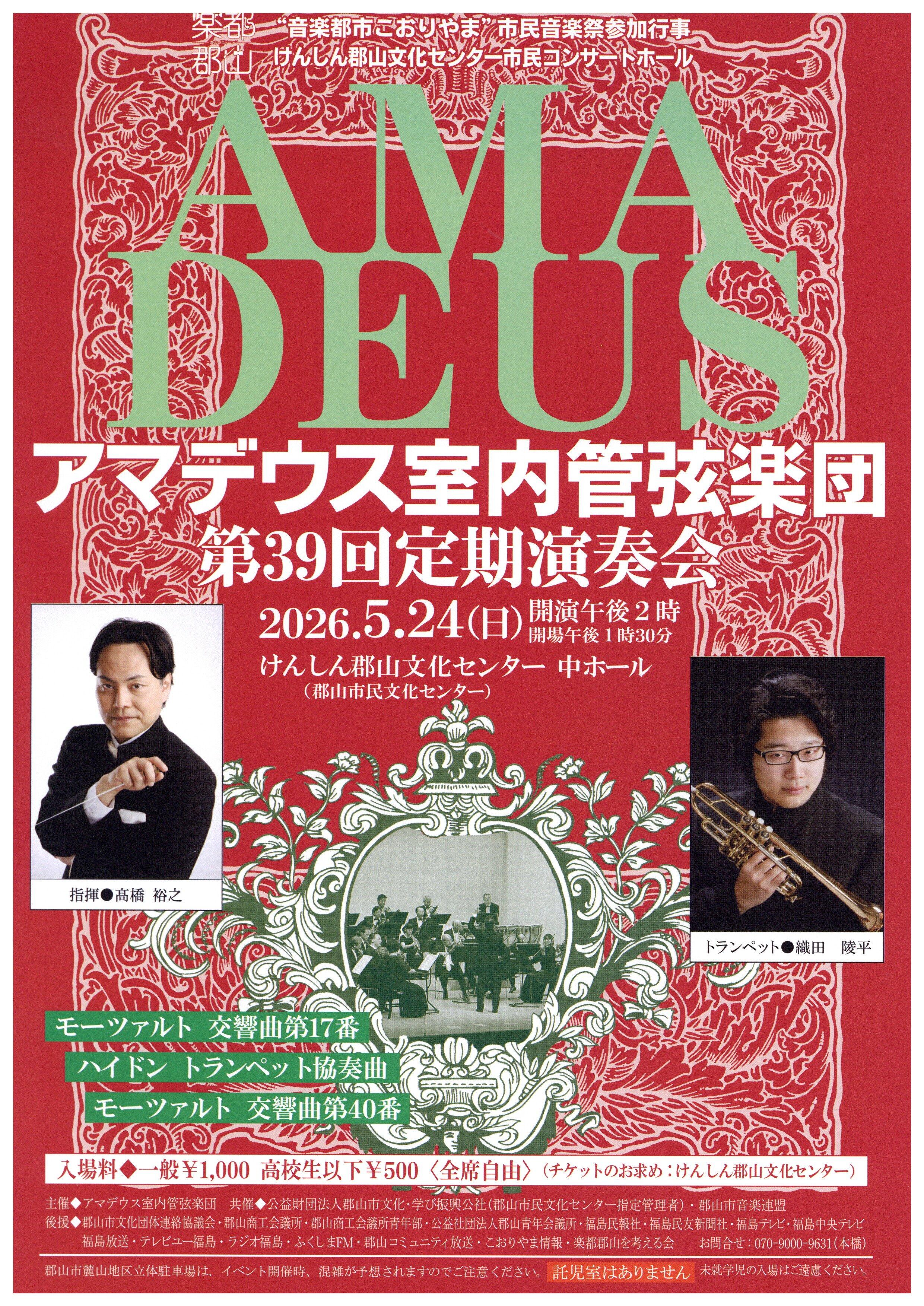 音楽 中ホール 市民コンサートホール アマデウス室内管弦楽団第39回定期演奏会 開催日時 2026年5月24日(日) 14:00開演 会場 中ホール 入場料 一般 1,000円高校生以下 500円※未就学児の入場はご遠慮ください。