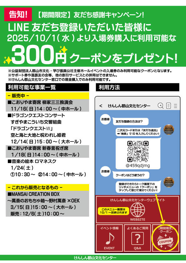 けんしん郡山文化センターでは、LINEの友だち登録をいただいた皆様に2025/10/1(水)より、