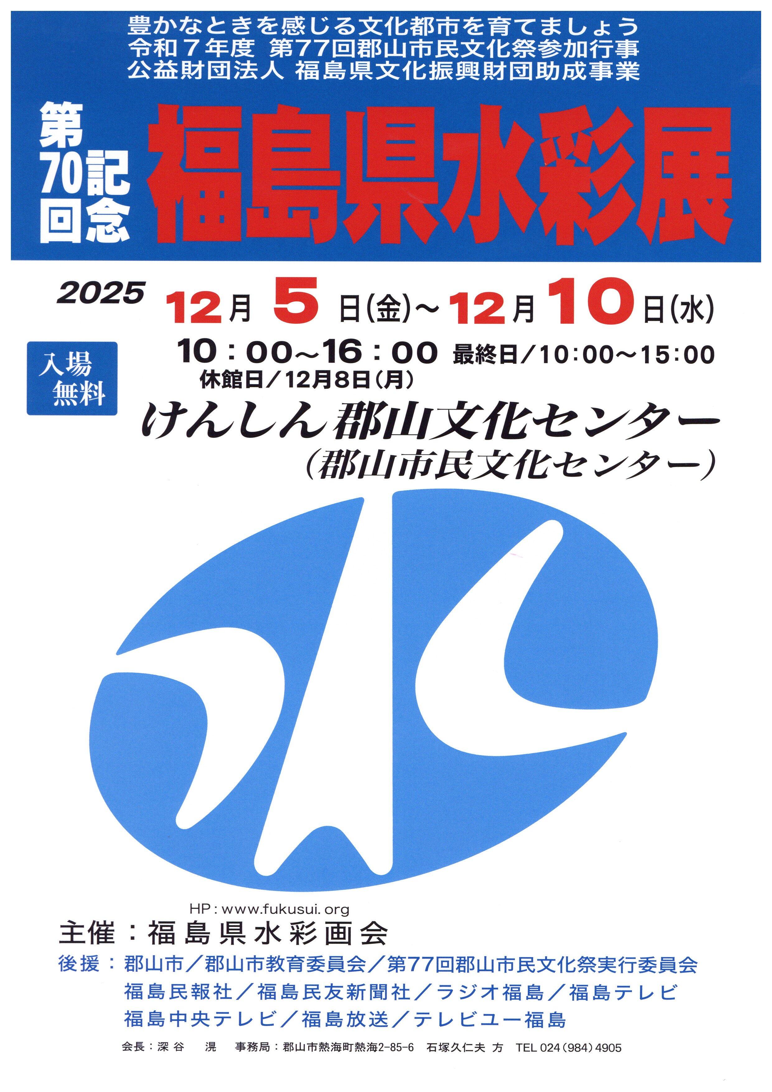 展示 展示室 第70回福島県水彩展(第77回郡山市民文化祭参加行事) 開催日時 2025年12月5日(金)~2025年12月10日(水) 【時間】10:00~16:00※12月8日(月)は休館日となります。※最終日12月10日は15:00まで 会場 展示室 入場料 無料