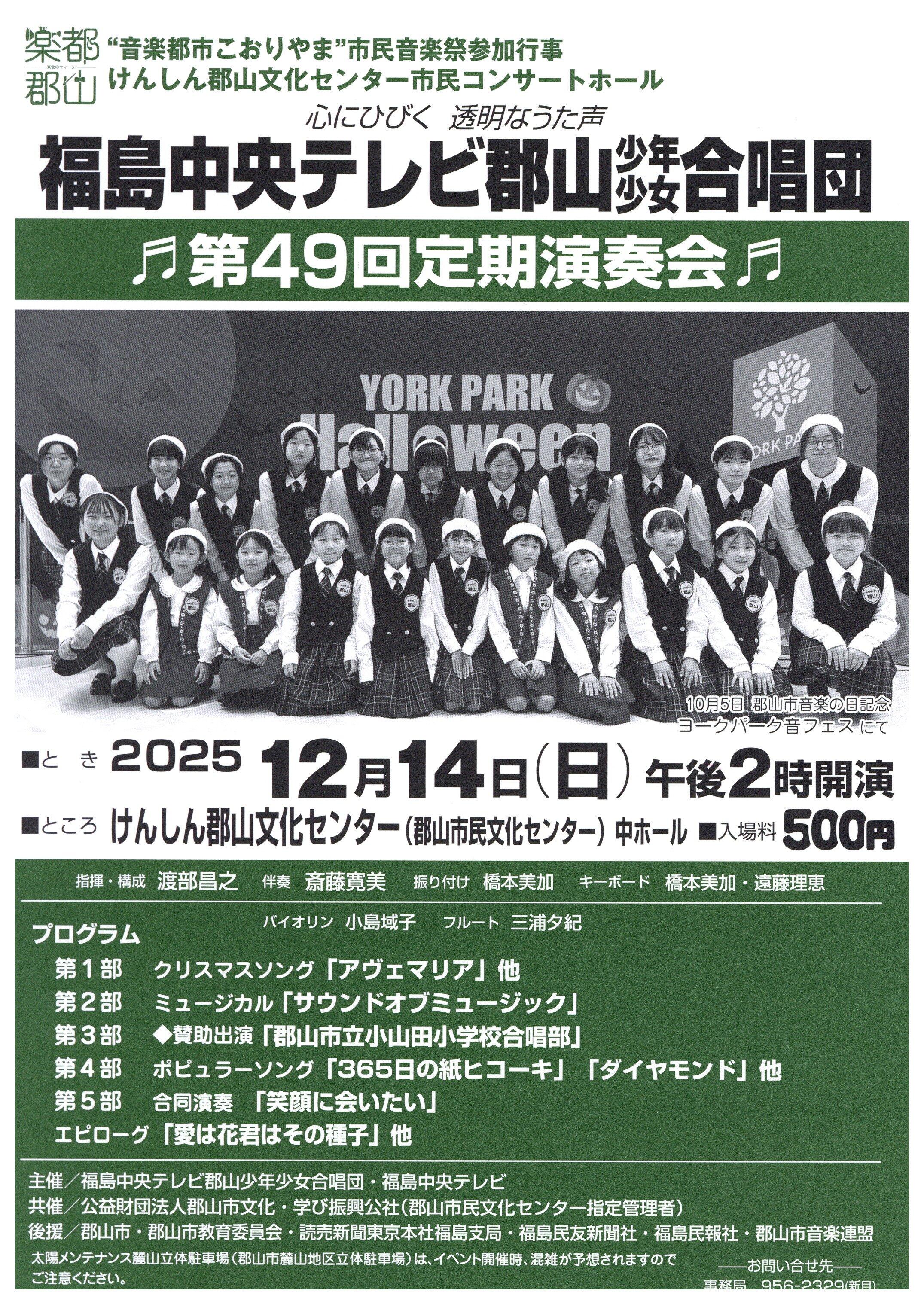 音楽 中ホール 市民コンサートホール 福島中央テレビ郡山少年少女合唱団第49回定期演奏会 開催日時 2025年12月14日(日) 14:00開演 会場 中ホール 入場料 入場料 500円未就学児入場無料