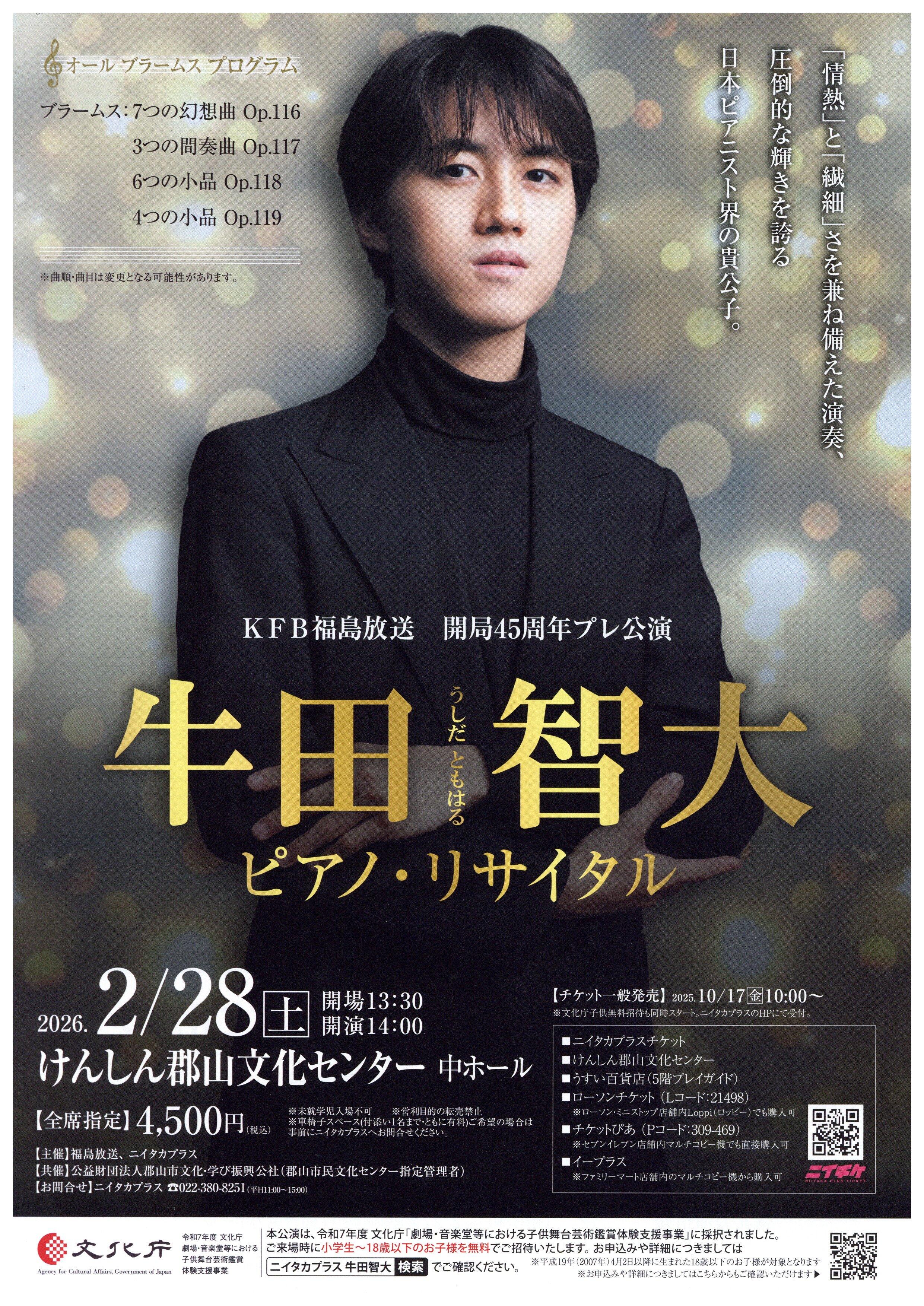 詳細は、主催者であるニイタカプラスのウェブサイト(外部サイト https://www.niitaka-plus.com/ticket/tomoharu_ushida_koriyama/)をご覧ください。