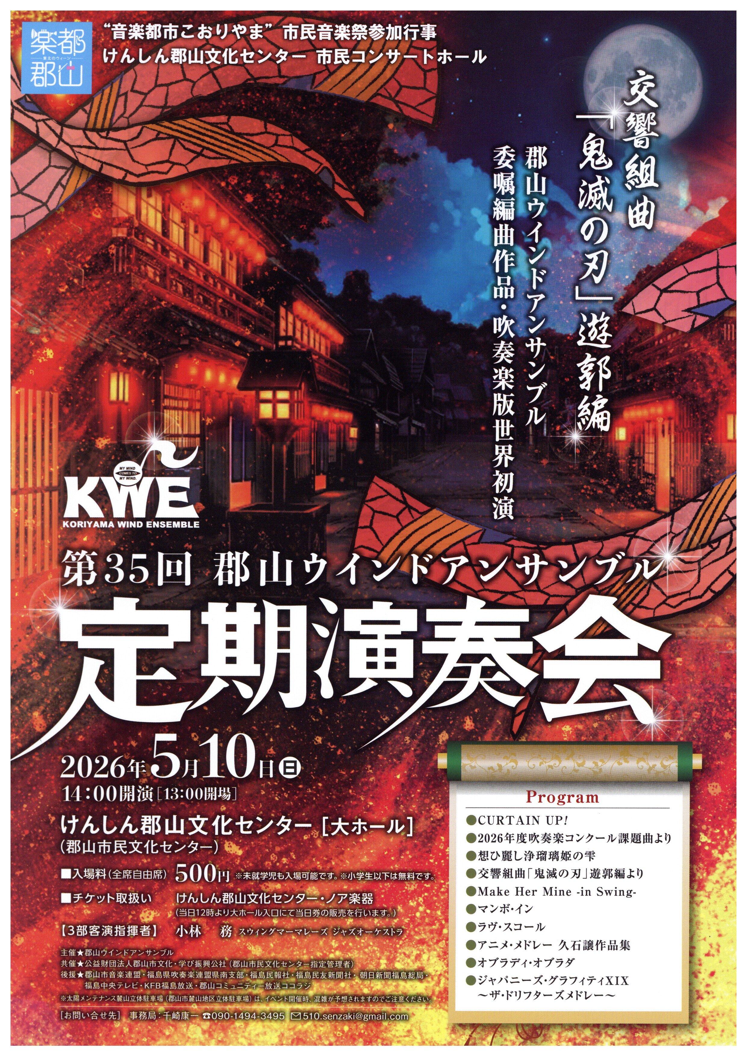 音楽 大ホール 市民コンサートホール 第35回郡山ウインドアンサンブル定期演奏会 開催日時 2026年5月10日(日) 14:00開演 会場 大ホール 入場料 自由席 500円※小学生以下は無料です。※未就学児も入場可能です。