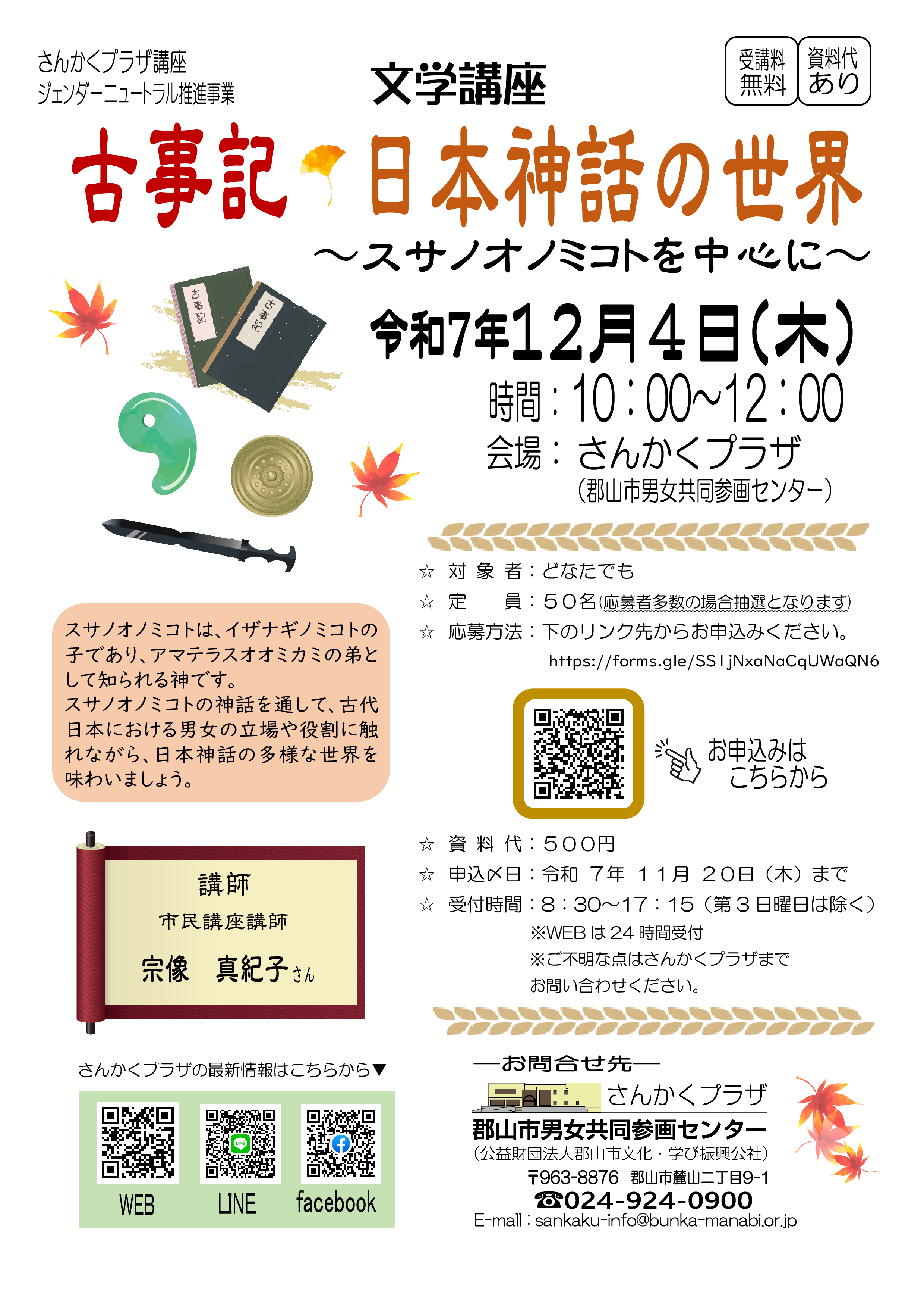 スサノオノミコトの神話を通して、古代日本における男女の立場や役割に触れながら、日本神話の多様な世界を味わいましょう。