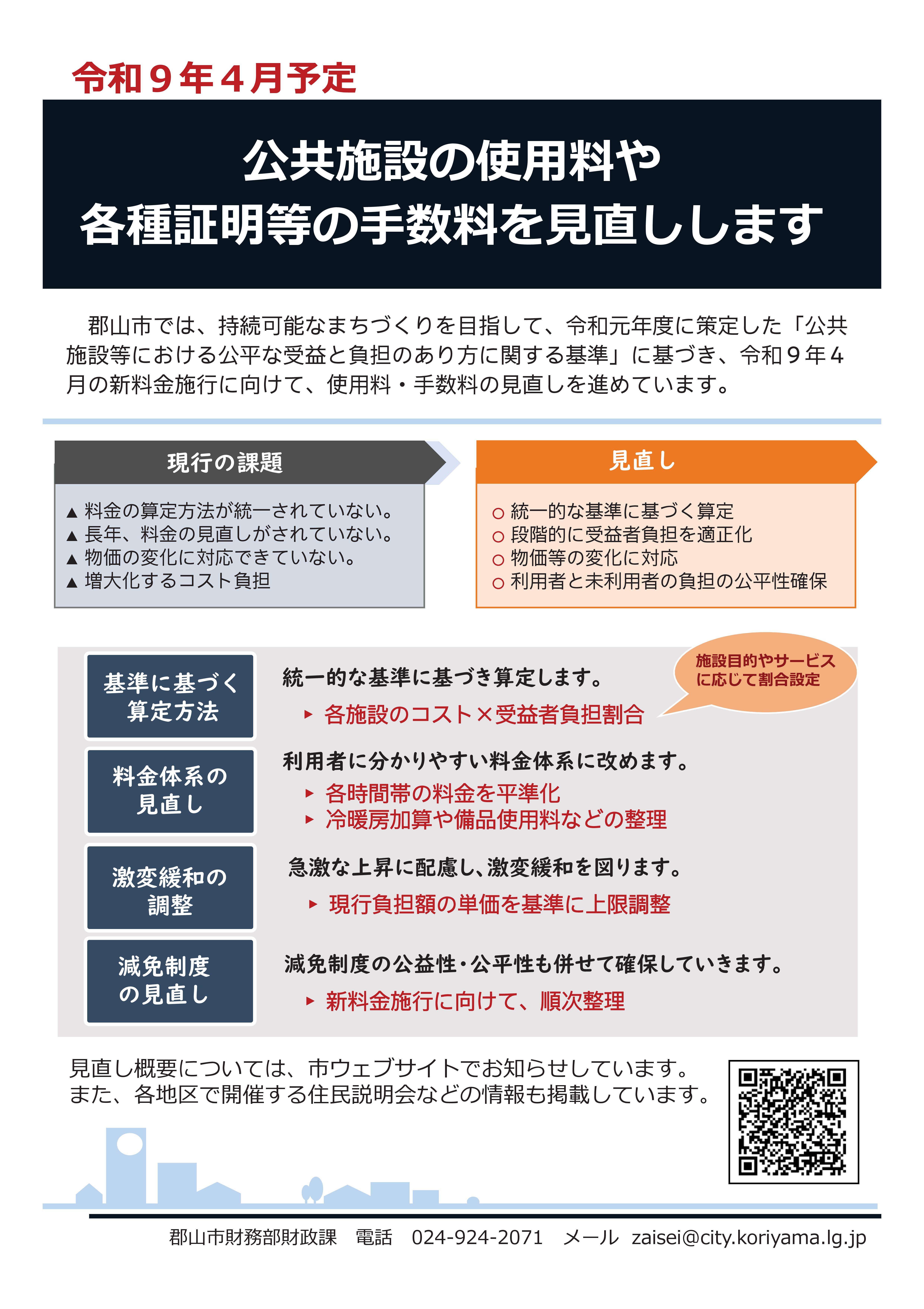 公共施設の使⽤料や各種証明等の手数料を⾒直しします(令和9年4月予定) 郡山市では、持続可能なまちづくりを目指して、令和元年度に策定した「公共施設等における公平な受益と負担のあり方に関する基準」に基づき、令和9年4月の新料金施行に向けて、使用料・手数料の見直しを進めています。 詳しくは郡山市ウェブサイトをご覧ください。